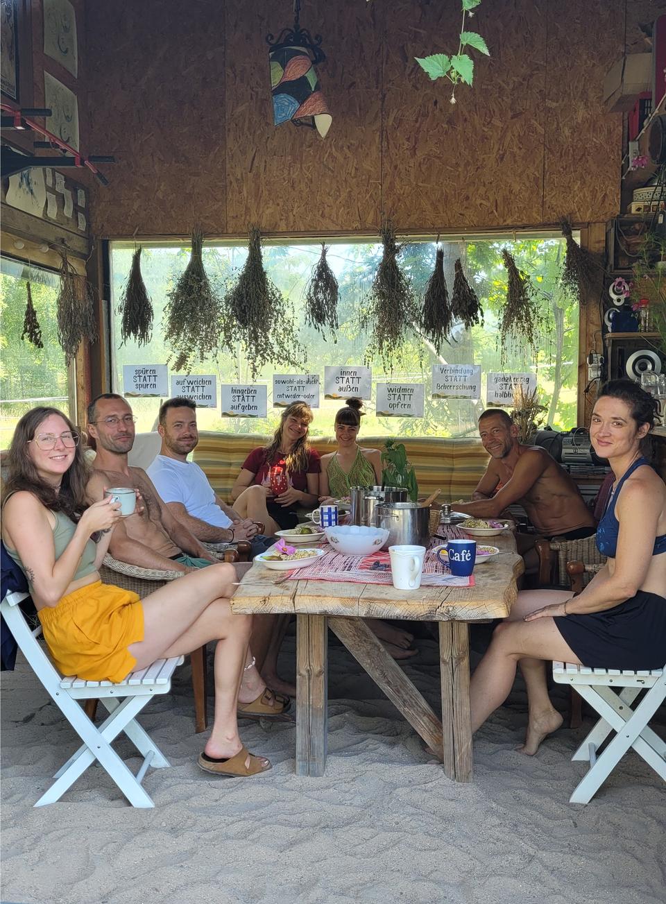 Geselliges Beisammensein nach dem gemeinsamen Kochen in der Wilden Waldgartenküche