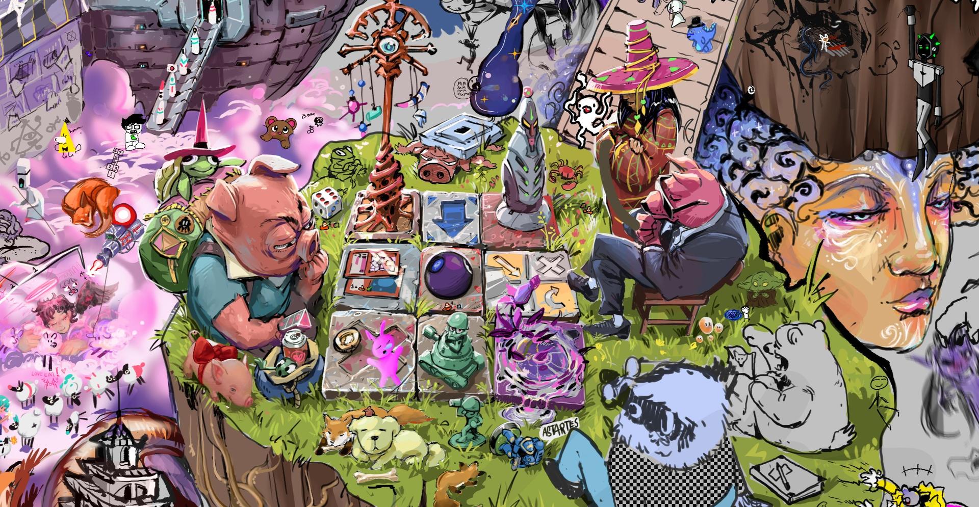 I was always fascinated by the Idea of drawing simultaneously and knew programs like OpenCanvas for quite a while. Yet when Magma became more popular and I tried hosting sessions I noticed how scattered all Original Characters and drawings were. I knew it must be possible to host jams differently and that characters could all be combined in one big coherent space. As a self-proclaimed apprentice of Kim Jung Gi, I always loved working purely with lines. I suggested the first jams be limited to only using lines and no color. It turned out that everyone loved it as the limitation allowed everyone to focus much more on the actual drawing process and perspective, instead of being overwhelmed by all the tools and technicalities of digital painting.