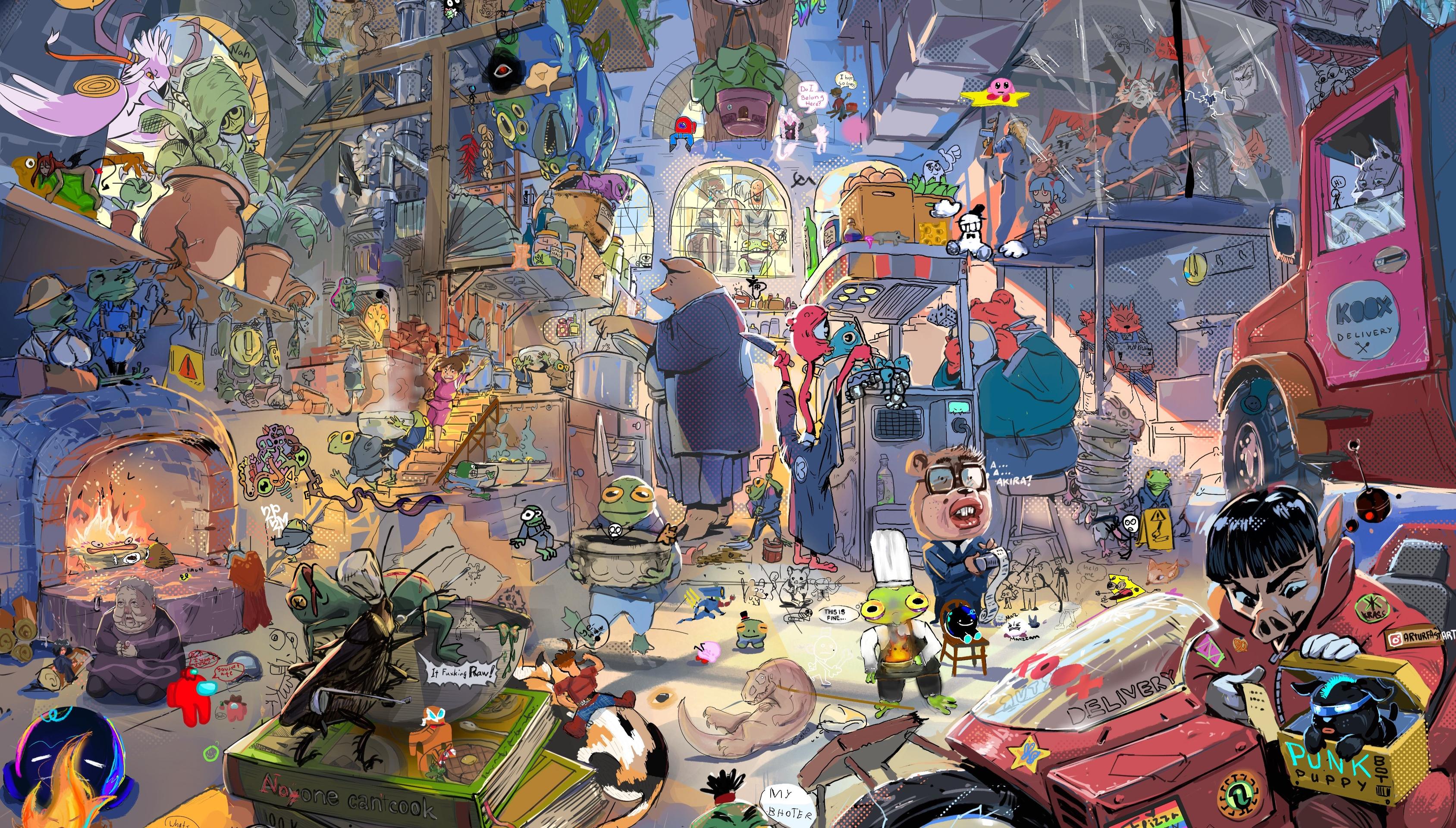 There are stages in the creation of a picture that require a lot of trust. Stages, where everything looks like it can't possibly come together. The beginning of a Line Realm session is one of the most intense moments with everyone's creativity in peak mode, laser-focused, fully invested to fill the gray canvas with a tale. A story unfolds right in front of your eyes, multiple nodes of human consciousness simultaneously conjuring up a coherent piece of work. A swarm of bees, a human collective render engine puts all the little pieces together until you end up with something that must have had a prompt, the size of a novel if it was AI.